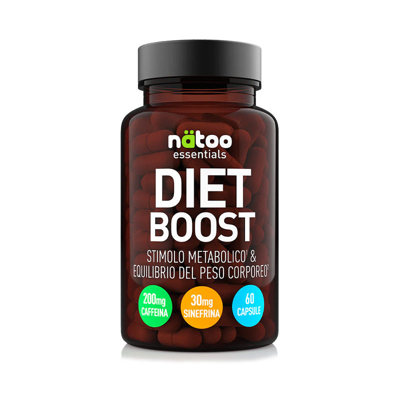 Natoo Diet Boost è una formula avanzata efficace per lo stimolo del metabolismo e come coadiuvante nelle diete ipocaloriche finalizzate alla riduzione del peso corporeo sia per uomini che per le donne. La sua efficacia è dovuta alla esclusiva combinazione di ingredienti estremamente potenti ed efficai, tra cui Paradoxin™, Cocoabuterol™, Bacopin®, Citrus Aurantium, Coleus Forskholii, Tè verde, il tutto potenziato da 200mg di caffeina. DIET BOOST vi aiuterà a raggiungere i vostri obiettivi stimolando il vostro metabolismo, mantenendo l’equilibrio del peso corporeo, supportando il metabolismo dei lipidi e favorendo il drenaggio dei liquidi.