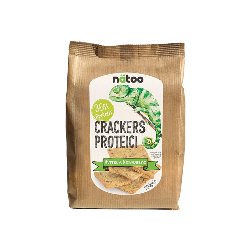 I Crackers Proteici di Natoo sono croccantissimi e gustosissimi crackers ad alto contenuto di proteine (36% per il gusto avena e rosmarino).